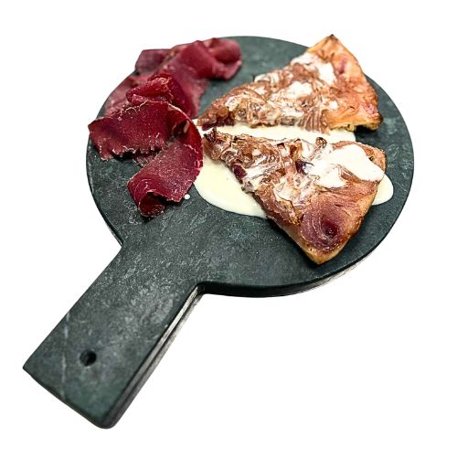 Gouda (over 48 months from the Netherlands), Holzhofer (15 months from Switzerland), Sanglé (3 months from Switzerland), Buffalo Blue (Italy), Goat Tometta with washed rind (Italy). Served with onion marmalade